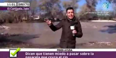 Esta semana, un corresponsal de la cadena española Canal Sur, identificado como Jorge Carmona, cayó a un río en plena transmisión de una nota.