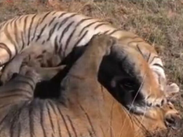 Una brutal pelea entre dos tigres de bengala fue captada en Sudáfrica. Las imágenes muestran como estos gigantescos felinos se enfrascan en un violento duelo.