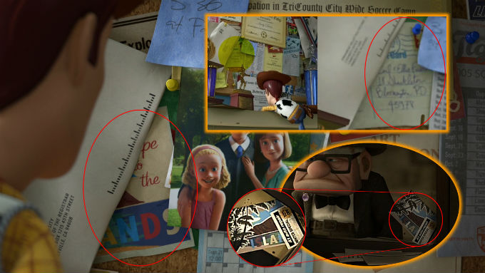 Esta teoría es alimentada por el hecho de que a los miembros de Pixar les gusta filtrar elementos recurrentes en cada una de sus cintas. Por ejemplo, han camuflado el carro de Pizza Planet, el número de aula A113 o la clásica lámpara con vida en varias producciones.