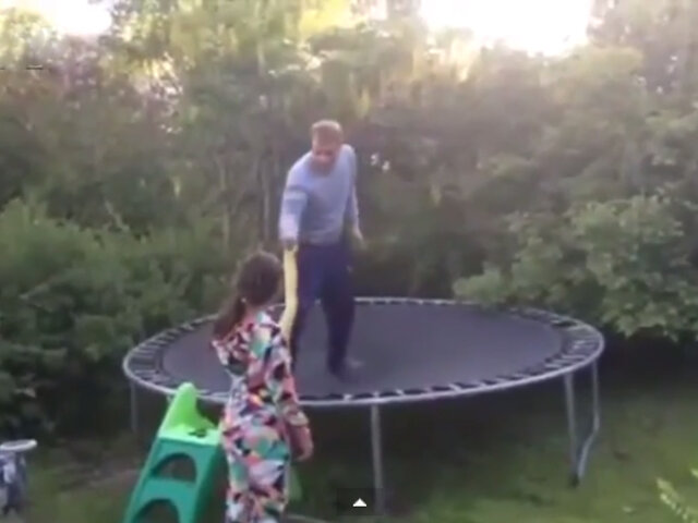 El siguiente video muestra el momento en que un hombre noruego en estado de ebriedad sufrió una aparatosa caída tras subir a una cama elástica. Ante la mirada atónita de su hija, el hombre sale disparado al no calcular el espacio que tenía para caer.