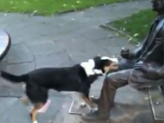 En este video se puede apreciar como un perro confunde a una estatua sentada en una plaza con una persona, e intenta jugar con ella esperando que esta le arrojara un palito que tenía bajo su pie.