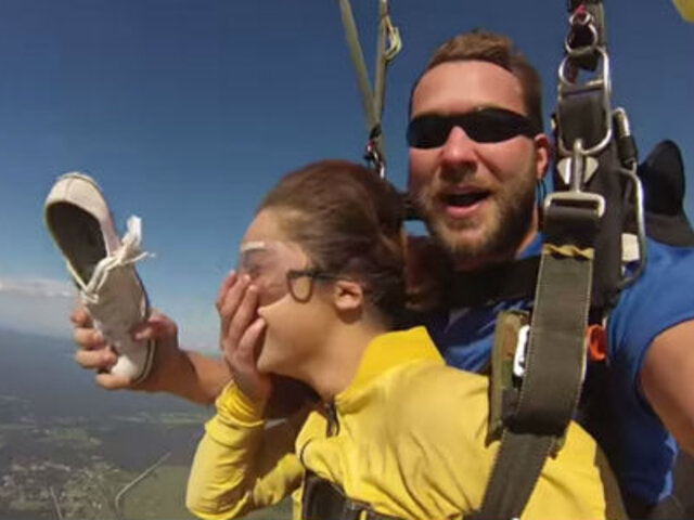 Un instructor de paracaidismo se llevó una gran sorpresa al ver el zapato de su acompañante volando por los aires en plena práctica de salto. En las imágenes se aprecia cómo el calzado impacta fuertemente contra su cara en cuestión de segundos. La joven aprendiz, sobresaltada y algo nerviosa, logra atrapar en una veloz hazaña el escurridizo calzado, que golpeó por casualidad el rostro de su valiente profesor.