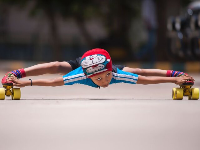 Gagan Satish es toda una celebridad en Bangalore, en la India. Y es que este niño de tan solo seis años tiene una gran flexibilidad que le permitió pasar patinando debajo de 39 autos.