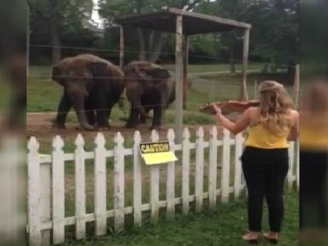 Una violinista descubrió que los elefantes aman la música clásica, o al menos esta pareja de elefantes, que se fascinó ante la presencia de esta mujer que tocaba el violín.