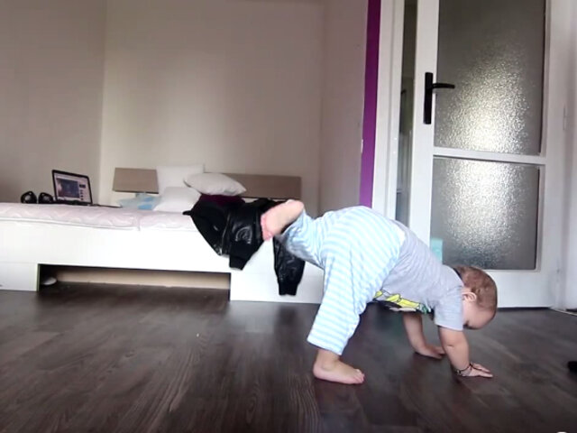 Las imágenes muestran como el bebé patalea, gira sobre sí mismo, aplaude grita y disfruta. Sin duda toda una imitación de su padre.