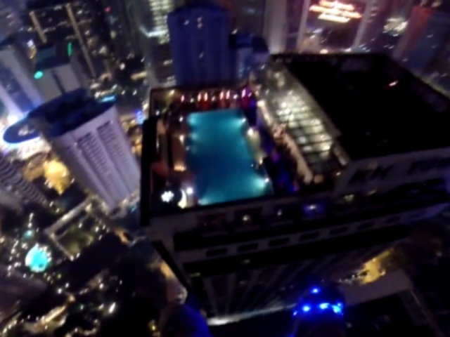 John Van Homes realiza salto de base hace mucho tiempo y esta vez intentó demostrar a sus amigos que su afición puede hacerle muy popular en las fiestas con piscina. Es por eso que subió a más de 1000 pies de altura a una torre de Kuala Lumpur para saltar y caer de manera precisa a una piscina ubicada en la cima del hotel en el que varios de sus amigos celebraban.