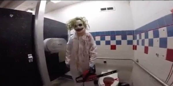 En esta ocasión se trata de un sujeto que, vestido con un enterizo blanco, con una máscara de “Jocker” y manchado de sangre, aterroriza a los usuarios de un baño público. En las imágenes, se muestra cómo el bromista espera a que sus víctimas estén en una posición vulnerable para asustarlos con el sonido de una motosierra.