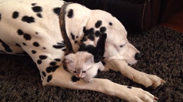 Adorable perro de raza dálmata que abraza a un pequeño gatito conquista las redes.