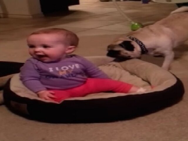 Este curioso perro que hace de todo para sacar a ésta bebé que quiso tomar una siesta en su cama.