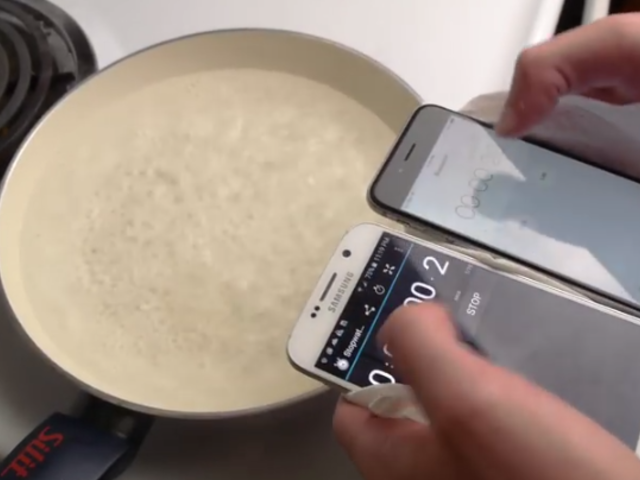 El experimento muestra qué es lo que sucede al ser metidos a un recipiente con agua hirviendo, un celular Samsung Galaxy S6 y el iPhone 6. En el video se observa cómo la pantalla del iPhone 6 se tiñe de negro y se apaga a los pocos segundos de ser colocado en el agua. El clip fue compartido en YouTube el 14 de abril y ya cuenta con más de 2 millones de visitas.