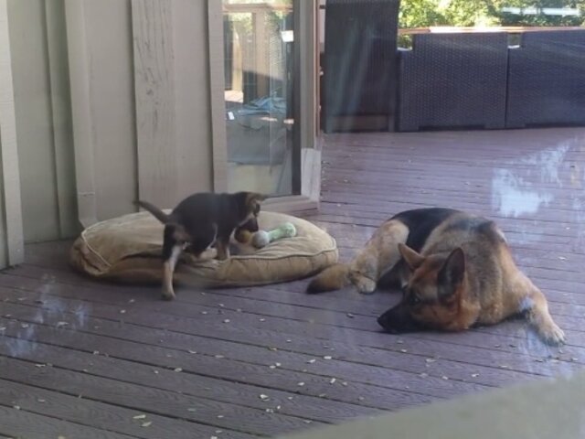 Al parecer este pastor alemán lo único que quiere es tener un momento de tranquilidad, pero no puede hacerlo si su pequeño cachorro quiere seguir jugando. Como si fuera un bebé humano, el cachorro quiere jugar y hacer travesuras, pero su madre le puso en claro que cuando ella dice que es hora de dormir, es hora de dormir.