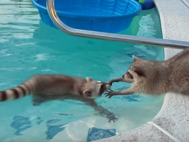 Mapache tiene un ‘ataque’ de nervios porque su hermano nada en la piscina