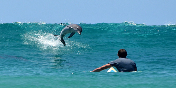 Wategos Beach es una playa muy conocida en Byron Bay, Australia, no solo por sus excelentes olas para practicar surf sino también por la presencia de unos visitantes muy simpáticos. Y es que en estas agitadas aguas los tablistas siempre se encuentran con grupos de delfines que parecen acompañarlos en todas sus maniobras y esto se ha convertido en todo un atractivo turístico en dicho lugar. Definitivamente estar cerca de estos animales tan dóciles es una experiencia única e inolvidable, por eso la mencionada playa siempre tiene gran cantidad de visitantes.