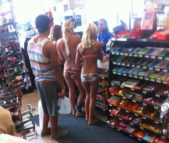 En la fotografía que fue subida a la red social Imgur por un usuario en los Estados Unidos, se aprecia lo que sería un día playa sin nada fuera de lo común, con tres chicas en bikini comprando en una tienda.