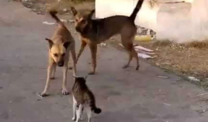 En el video se puede ver como el felino se enfrenta a un perro que prácticamente le dobla el tamaño y que, bastante agitado, le ladra y busca acorralarlo. El gato, amenazante, se eriza listo para defenderse. En un determinado momento, otros perros se unen al primero.
