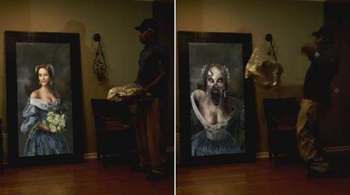 Luego de esto, la entrada de la casa vuelve a estar en silencio y la cámara enfoca con particular atención un gran cuadro que retrata a una bella mujer de antaño. Súbitamente, la mujer del cuadro se mueve, adopta una espantosa figura y lanza un terrible grito que llena de pavor a los sujetos.