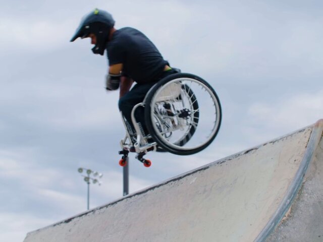 El joven de 24 años, que nació con espina bífida, realiza osados trucos, gira y se balancea sobre su silla de ruedas. Él denominó a su disciplina como WCMX, una mezcla de skate y bmx pero sobre una silla de ruedas.