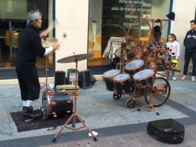 En las calles de Zaragoza, España, un hombre toca la batería arrojando los palos de los tambores. Luego de que estos chocan con el instrumento, rebotan y vuelven hacia su mano. Todo esto sin perder el ritmo.