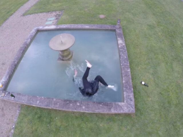 Lo que no advierte es que pronto va a pisar en falso. Detrás de ella hay una pileta que adorna lo que parece ser un parque y que la señorita no ha visto. Un paso más atrás y la mujer cae hacia el agua y termina completamente mojada. Un fail más en la historia del internet.