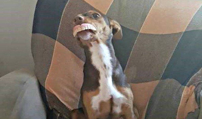 Perrita se ''roba'' dentadura postiza de una anciana y las fotos son furor en redes
