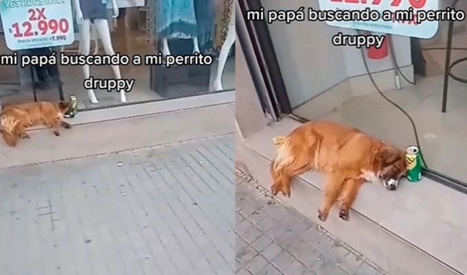 ¿Estaba de parranda?: Buscan a perrito perdido y lo encuentran tirado en una esquina con latas de cerveza