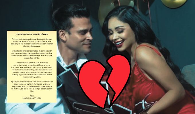 "Ante los recientes acontecimientos suscitados que involucran mi vida familiar, quiero informar a la opinión pública mi separación definitiva con el señor Christian Domínguez. Entiendo el interés de los medios de comunicación por hablar conmigo, pero por el momento no daré declaraciones por la tranquilidad de mi familia y en especial de mi hija", se lee en el pronunciamiento.
