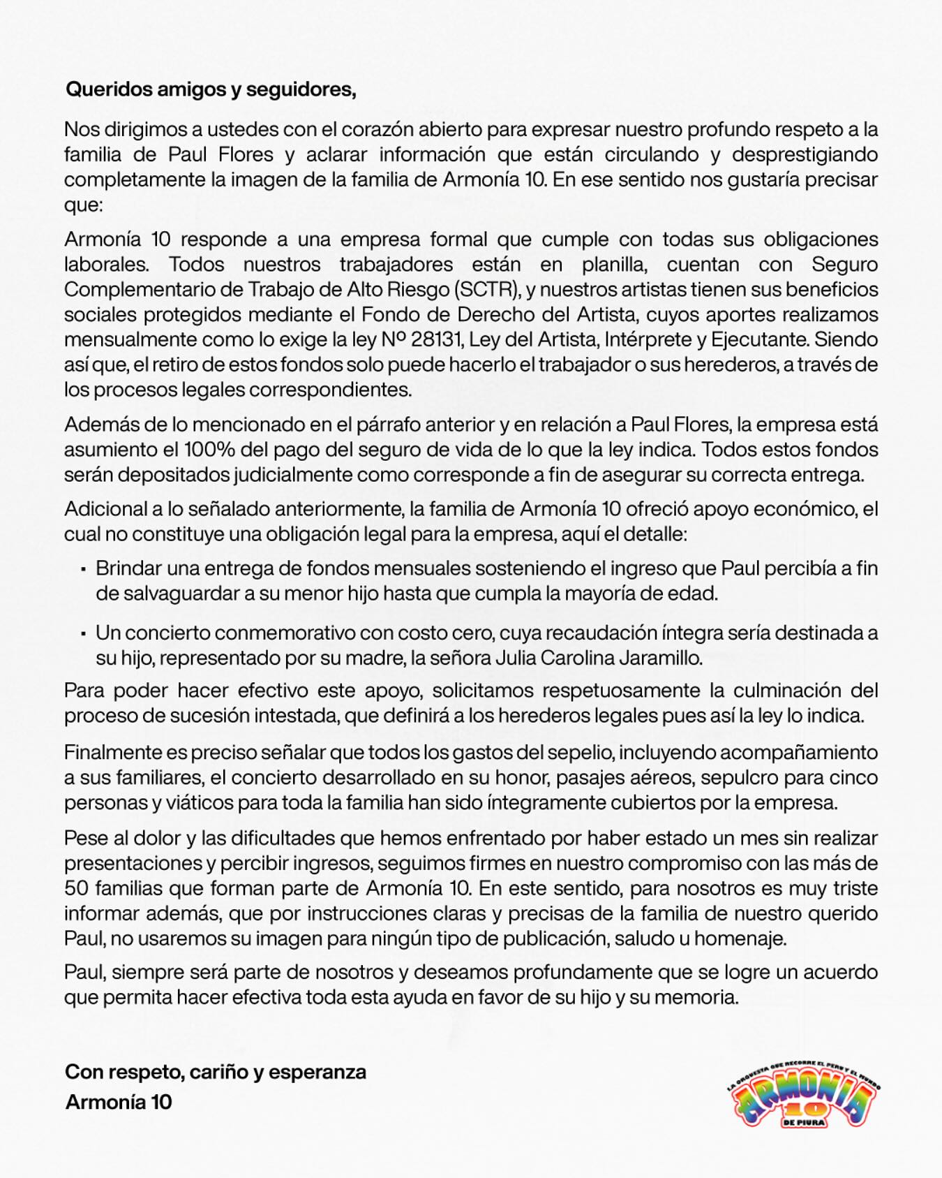 La agrupación Armonía 10 se pronunció públicamente tras las declaraciones de Carolina Jaramillo, viuda de Paul Flores, quien denunció que la familia del fallecido cantante no ha recibido los beneficios laborales correspondientes por su muerte en el atentado ocurrido el 16 de marzo.