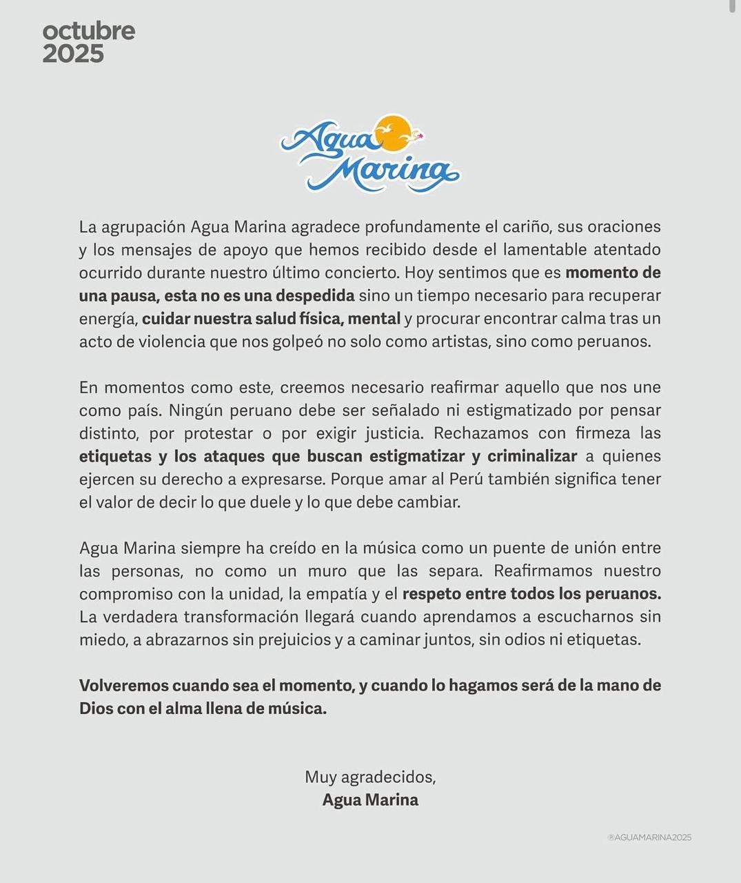 La reconocida agrupación de cumbia Agua Marina anunció de manera oficial este viernes que hará una pausa temporal en sus presentaciones tras el lamentable atentado ocurrido durante su último concierto en Chorrillos. La decisión busca que los integrantes del grupo se recuperen física y emocionalmente, luego de este hecho violento perpetrado por extorsionadoras.