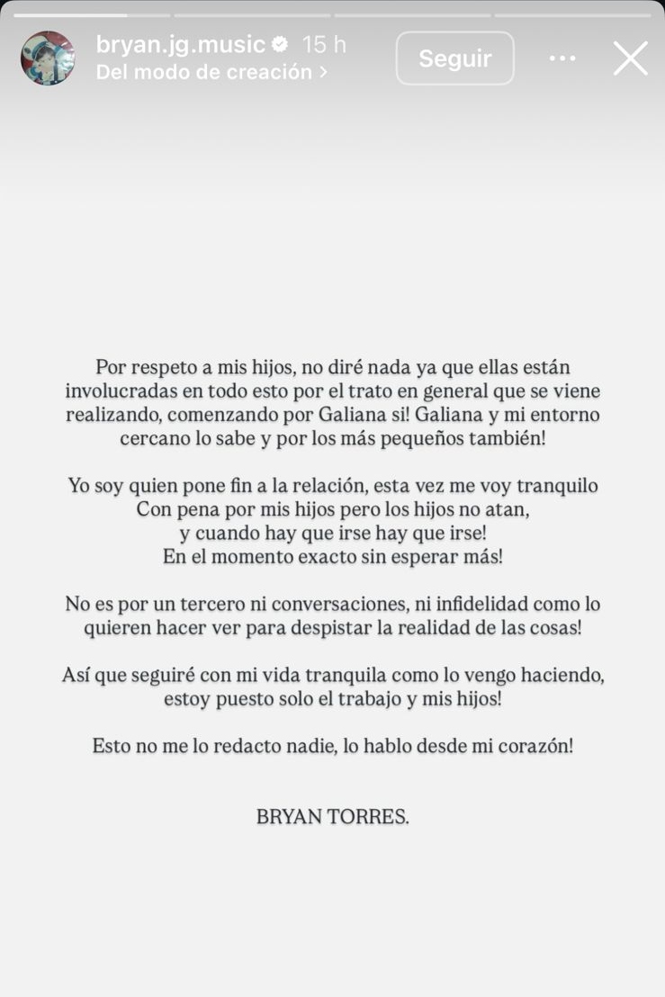 A través de un comunicado difundido en redes sociales, Bryan Torres aseguró que la decisión de terminar la relación fue suya y explicó que actuó “por respeto a sus hijos”. “Yo soy quien pone fin a la relación, esta vez me voy tranquilo. Con pena por mis hijos, pero los hijos no atan y cuando hay que irse, hay que irse”, expresó el cantante.