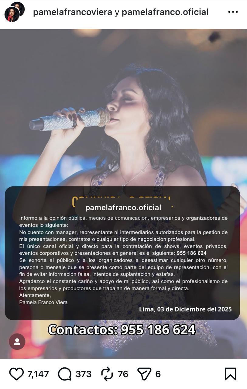 La cantante Pamela Franco sorprendió a sus seguidores al anunciar que ya no tiene mánager, decisión que generó polémica por ocurrir apenas días después de que su exrepresentante expusiera públicamente cuánto cobra por sus presentaciones. El anuncio fue difundido en la madrugada del viernes 9 de diciembre a través de un comunicado en sus redes oficiales.