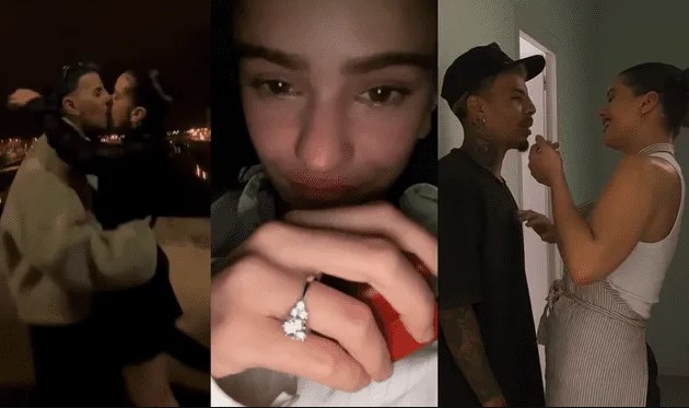 En el video se puede apreciar a Rosalía, con los ojos llorosos, muestra un anillo de diamantes en su dedo. "Oh, Dios mío, se me está acabando el rímel", se puede escuchar a la cantante española, todavía sosteniendo la caja de la sortija, antes de besar a Rauw Alejandro.