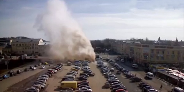Cámaras de video en la ciudad rusa de Smolenks captaron el momento en que un enorme géiser aparecía entre los autos.