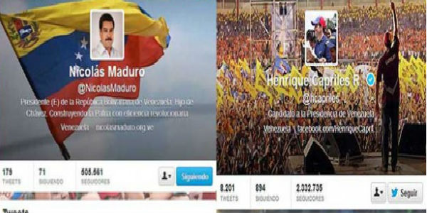 Los candidatos presidenciales Maduro y Capriles son alentados a través de la red social Twitter.