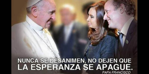 Gran discusión se generó hoy en Buenos Aires por la aparición de carteles con una fotografía del Santo Padre junto a la mandataria, Cristina Fernández, y su candidato a diputado, Martín Insaurralde.