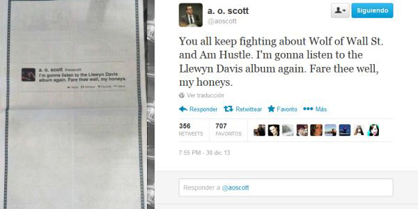 Resulta que CBS Films usó el tuit de un crítico cinematográfico para destacar a su película ‘Inside Llewyn Davis’ como la mejor del año y es que el especialista había tuitiado elogiando dicho film. La compañía publicó el tuit a modo de aviso publicitario, un método promocional poco visto hasta ahora.