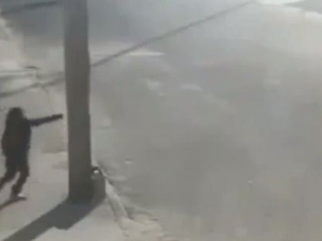 Un peatón caminaba tranquilamente por la acera cuando de pronto apareció un auto descontrolado a toda velocidad que terminó saliéndose de la pista. Cuando se creía que la suerte del transeúnte estaba echada encontró en su trayecto un poste como refugio.