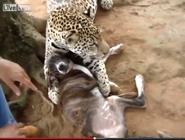 Los animales de distintas especies también pueden hacer amistades rápidamente. Un jaguar domesticado demostró que su mejor aliado y compañero de aventuras podría ser un perro que recién acababa de conocer. El felino sostiene fuertemente entre sus patas delanteras a la mascota que al principio se queja con suaves aullidos, aunque no se sabe si por dolor o por miedo. En un primer momento podría temerse que el enorme animal quisiera comerse al perro; sin embargo, y para sorpresa de los hombres que crían al jaguar, este empieza a lamerlo hasta que el perro se tranquiliza y disfruta de los toscos cariños. Según el autor del video, era la primera vez que estos animales se encontraban dentro de este patio.