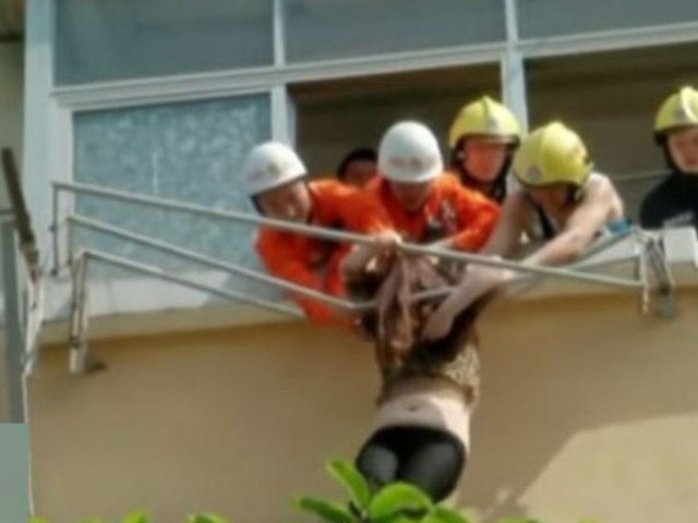 El hecho ocurrió en la ciudad de Hangzhou, en la provincia oriental de Jiangsu, China, donde una mujer ebria que se encontraba sentada en uno de los barrotes de hierro de un tendedero, fue rescatada por bomberos. La barra cedió justo en el momento en que el equipo de rescate terminó de atar a la mujer con una cuerda de seguridad. Afortunadamente a uno de los bomberos le dio tiempo a atrapar a la fémina.