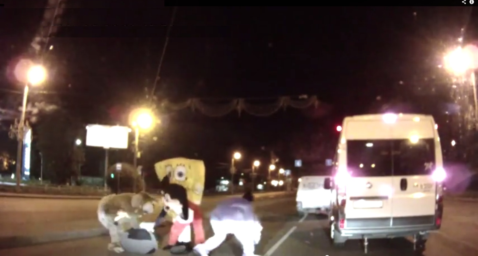 En una carretera de Rusia, dos sujetos vestidos de Mickey Mouse y Bob Esponja descienden de un vehículo para tratar de arreglar un adelantamiento algo temerario. Sin embargo, ambos "personajes" terminan por agarrar a golpes a un conductor. Todo quedó registrado en las cámaras de seguridad.