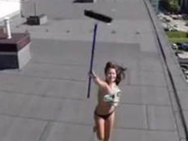 La cámara sorprendió a la joven cuando tranquilamente tomaba sol en la azotea de un edificio con los pechos descubiertos. La muchacha se encontraba echada en el suelo, casi desnuda, sin imaginar que un indiscreto drone pasaría. Tras darse cuenta de la maquina, la mujer indignada salió corriendo tapándose con una toalla y tomó una escoba para atacar al drone.