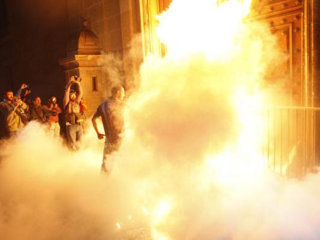 La multitudinaria marcha por la desaparición de los 43 estudiantes en Iguala, terminó con violentas manifestaciones en la que cientos de mexicanos prendieron fuego a la puerta principal del Palacio.