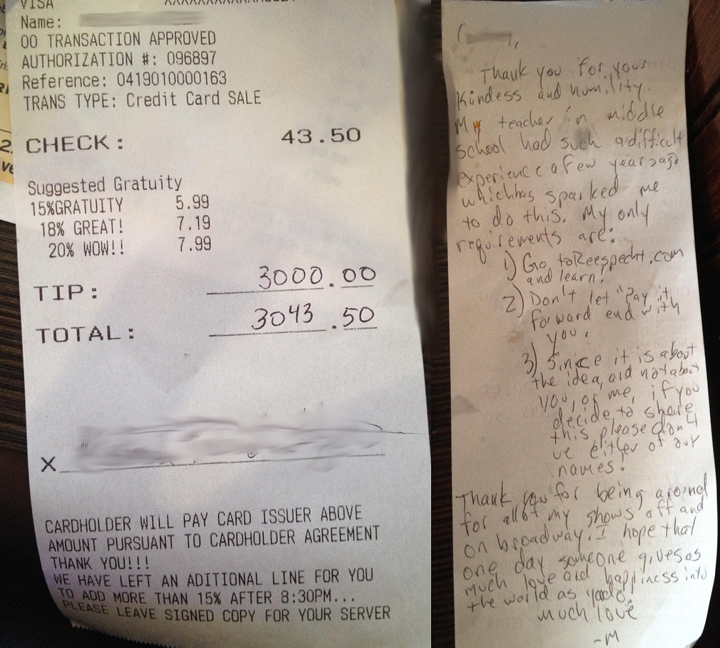 "Esta mujer ha estado sirviéndonos por casi un año. Ella es una persona simpática, y nos hablaba de cómo recibió una orden de desalojo el mes pasado", declaró Mike, quien había hecho un consumo de sólo 43 dólares. El cliente dejó una nota para la camarera explicando que estaba inspirado por una tragedia que le pasó a un ex profesor.
