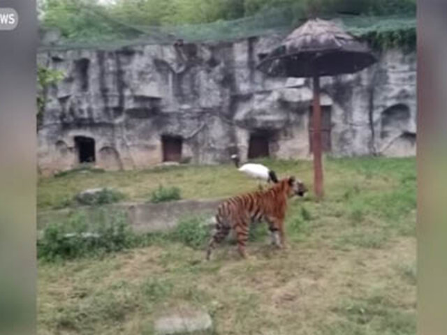 El ave cayó por accidente a la jaula de los felinos y tuvo que pelear para salvar su vida. Advertidos de su presencia, los felinos del zoológico de China intentaron varias veces atacarla.