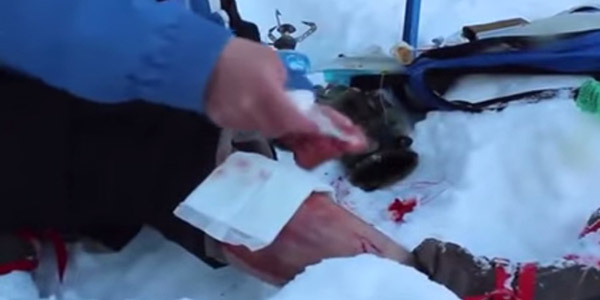 En este caso, un alpinista ruso tuvo un accidente mientras intentaba escalar en una zona bastante agreste y como consecuencia sufrió una serie de golpes graves. En el video publicado en YouTube se aprecia, en primer lugar, cómo adormece la zona con el hielo de la montaña. Luego se corta la pierna en el lugar del hematoma para dejar fluir la sangre. Finalmente sutura la herida.