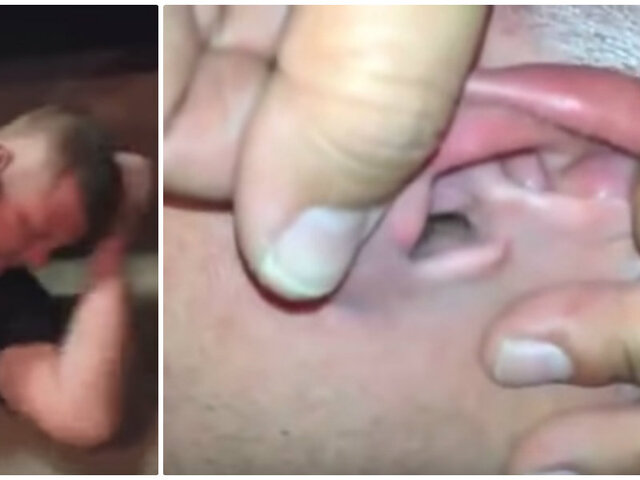 Las imágenes muestran la oreja del hombre siendo examinada por las personas, quienes detectan algo extraño en su interior. Cogen una pinza y comienzan a intentar sacar lo que hallaron, pero sin éxito.