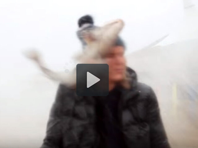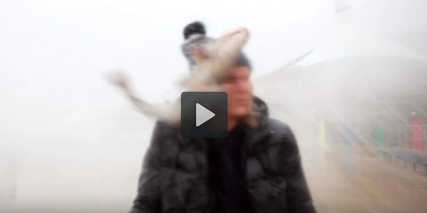 La bloguera Aimee Banniser se acercó a un conocido balneario en pleno temporal para grabar un despacho que posteriormente iba a ser publicado en su portal. Lo curioso fue que mientras hacía su reporte un pez salió con gran fuerza desde el mar y acabó impactando en su cara en plena grabación.