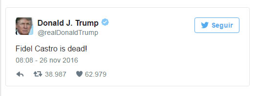 Donald Trump ofreció esta mañana su primera reacción tras la muerte del líder cubano en su cuenta de Twitter con una escueta frase: "¡Fidel Castro está muerto!".