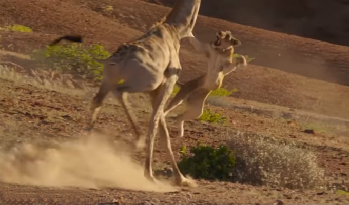 Sin embargo, su intento resulta un fracaso, pues en su afán de sobrevivir la jirafa la empuja con su cuerpo. Al caer, le da varios pisotones al felino y corre rápidamente del lugar, evitando ser su próxima presa.