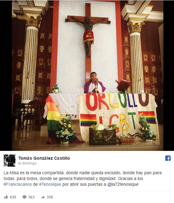 Fray Tomás González Castillo al postear en sus redes personales la foto en la que se aprecia la bandera del arcoíris, símbolo del orgullo gay, dijo que “La misa es la mesa compartida, donde nadie queda excluido, donde hay pan para todas, para todos, donde se genera fraternidad y dignidad”.