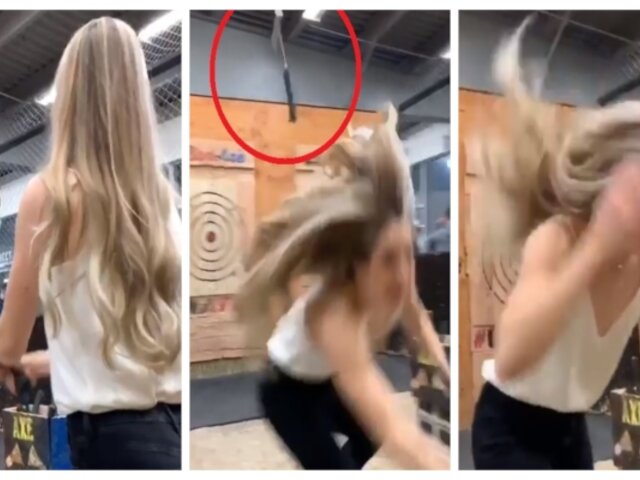 Ainsley Rae fue el pasado fin de semana a un centro especializado en compañía de su pareja. En esta área, arrojó el instrumento, este impactó en el piso, rebotó en la pared, y luego salió volando rápidamente hacia ella, quien quizá no logró tener buena puntería, pero demostró poseer buenos reflejos, ya que esquivó el hacha y se salvó de ser impactada.